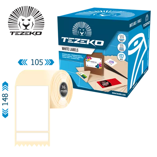 Šírka etikety: 105 mm • Výška etikety: 148 mm • Materiál etikety: Direct thermal • Vnútorný priemer cievky: 76 mm • Typ lepidla: Chladírenské • Farba: Bílý
