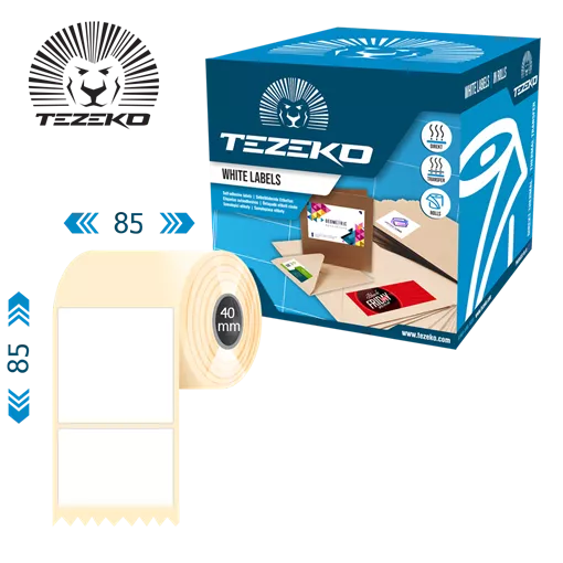 Šírka etikety: 85 mm • Výška etikety: 85 mm • Materiál etikety: Direct thermal • Vnútorný priemer cievky: 40 mm • Typ lepidla: Standardní • Farba: Bílý